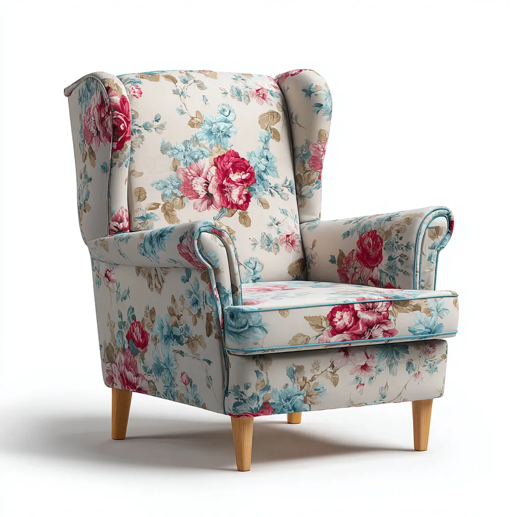 Rivestimento in tessuto con motivo floreale nei colori beige, rosso e azzurro. La struttura garantisce un adeguato supporto, mentre la base assicura solidità e resistenza nel tempo.